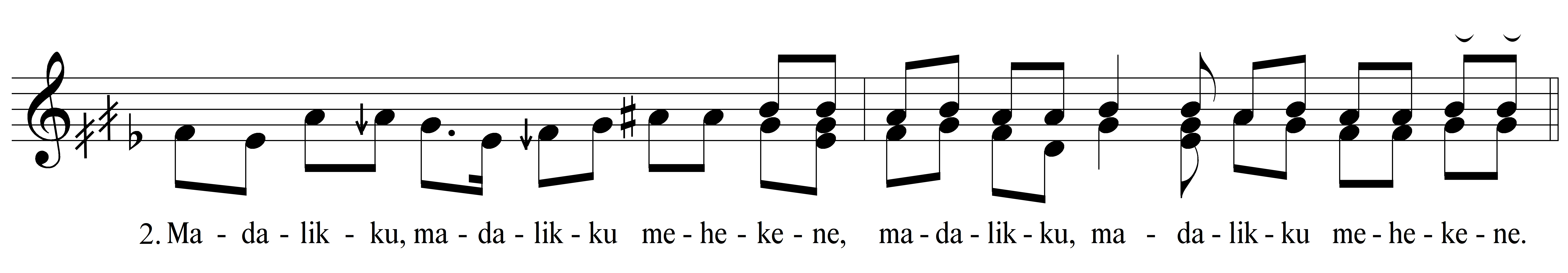 Näide 5. II rütmisüsteem; kolmetasandiline meetrum. Põllulaul, Jefim (Juhkim) Luuga meeskooriga, Uusvada k., 1977 (RKM, Mgn. II 3686 (1)).