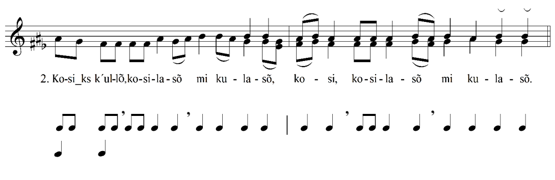 Näide 4. II rütmisüsteem; meetrumilöökideks on veerandnoodid. Jaanilaul, Elena (Oll´o) Laanetu kooriga, Suure-Rõsna k., 1976 (Estonie: Chants Seto, CD 2008, nr 6).