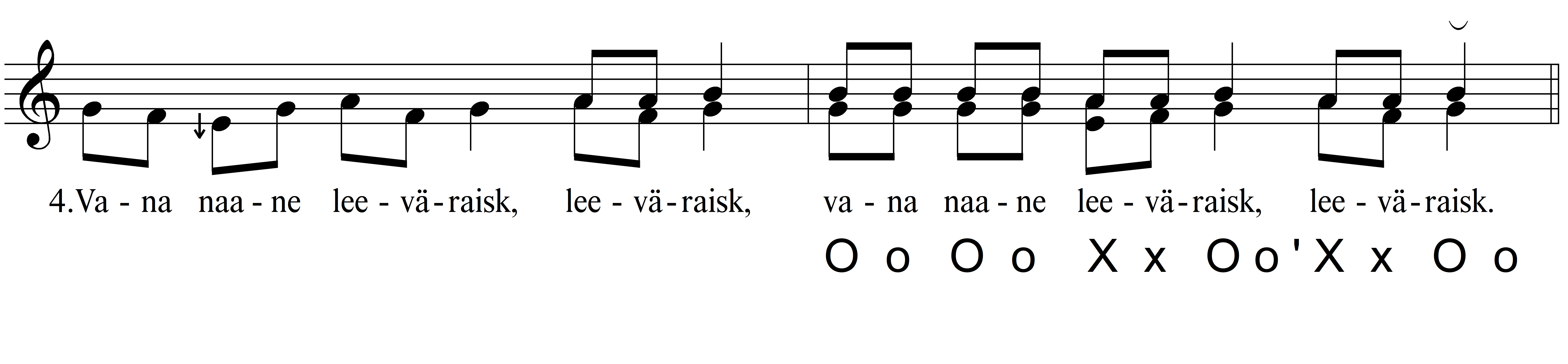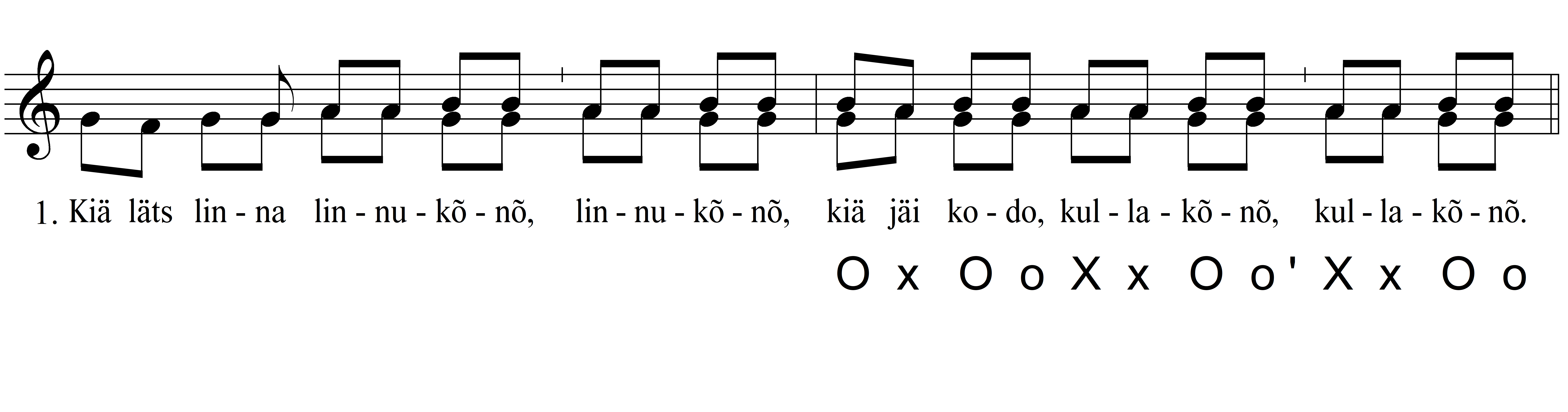 Näide 1. Kiä läts liina, linnukõnõ (mängulaul), Jako Hedo kooriga, Kolo k., 1913 (ERA, Fon. 92 c).