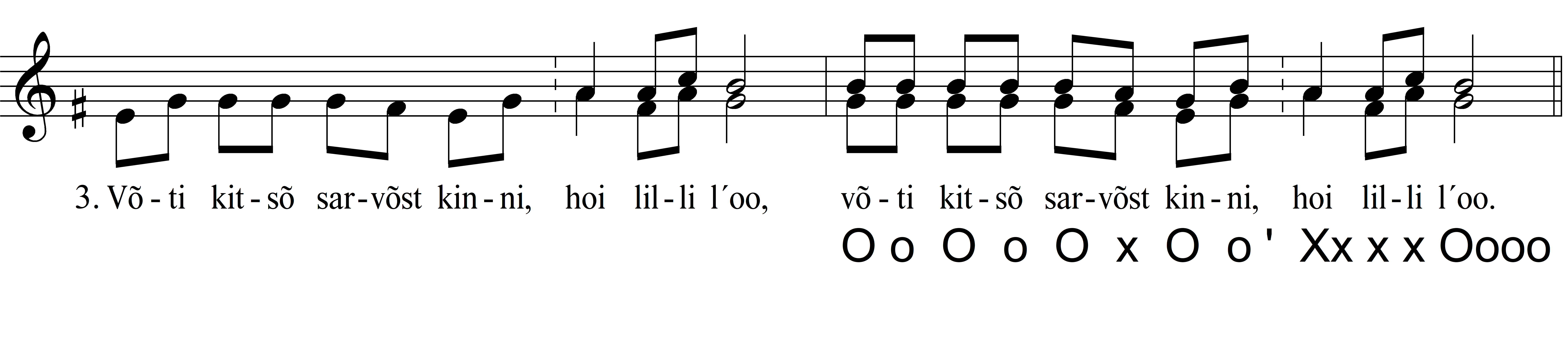 Veel üks huvitav asjaolu on viisi ühendamine erineva struktuuriga tekstiga. Kahes esituses (näited 1 ja 2) leiame rühma III.B jaoks tavalist tekstiehitust, kus melostroofi esimese viisireaga lauldakse kaheksasilbilist värsirida (või, harvem, rõhulist lühirida) ning teise reaga lauldakse erilise rütmiga refrääni – antud juhul “hoi lil´oo” ja “hoi lilli l´oo”. Ühes esituses (näide 3) sobitatakse aga kaherealise viisiga üherealist teksti, laiendades seda esimese poolrea kordamise abil: “teie mi / orgo, / teie mi / orgo / ora- / sõ” (skeem ab ab cd – esimese rõhurühma allajoonestamine näitab selle laiendamist lisasilbiga). Sarnast võtet leiame viisitüübis III.B.1.a1, kuid seal on kasutatud värsirea laiendamise teine skeem.