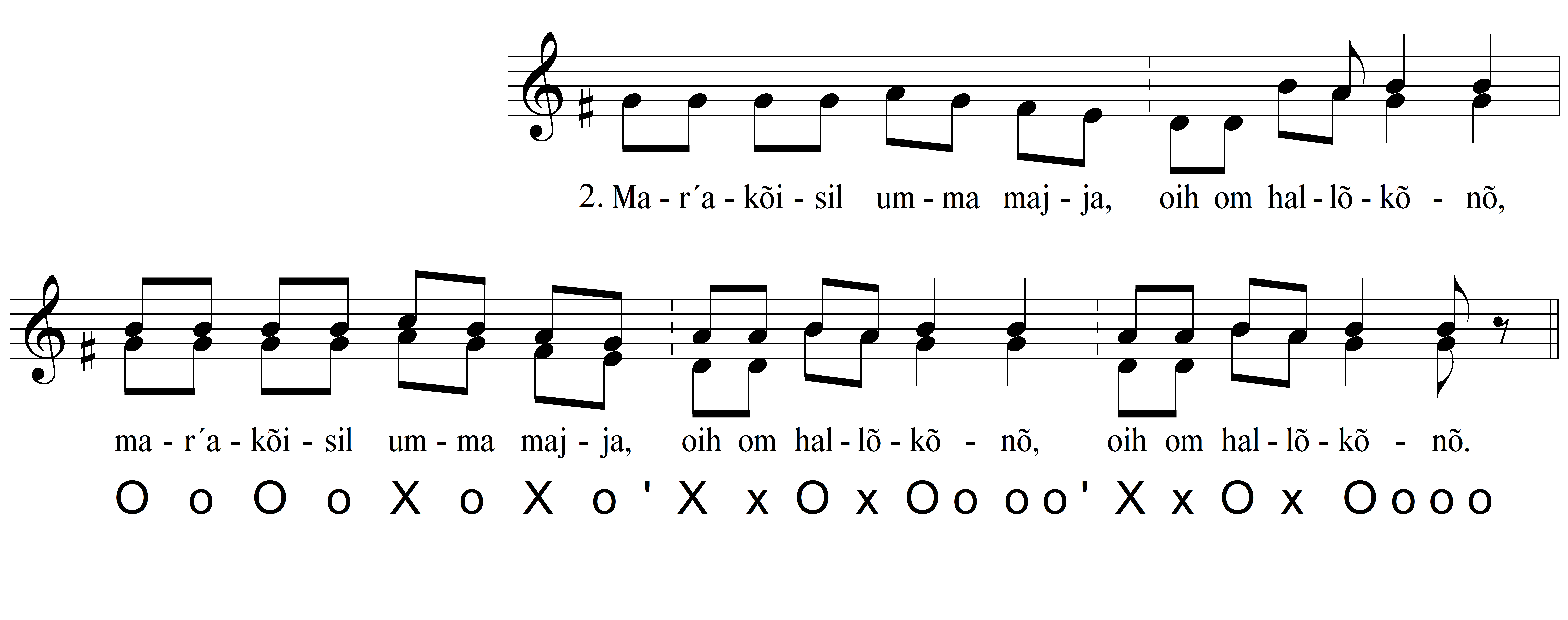 Viisitüübiga III.B.2.a2 lauldakse peolaulu „Tahtu-i kuigi kodo minnä”, mille refrääniks on “oih om hallõkõnõ”. Sama laulu lauldakse ka viisitüübiga III.B.1.a2, millel on teine HR mudel (nende kahe viisitüübi võrdlust vt allpool). Muus mõttes on need kaks viisi sarnased – refrääni silbirütmiks on mõlemal juhul muster