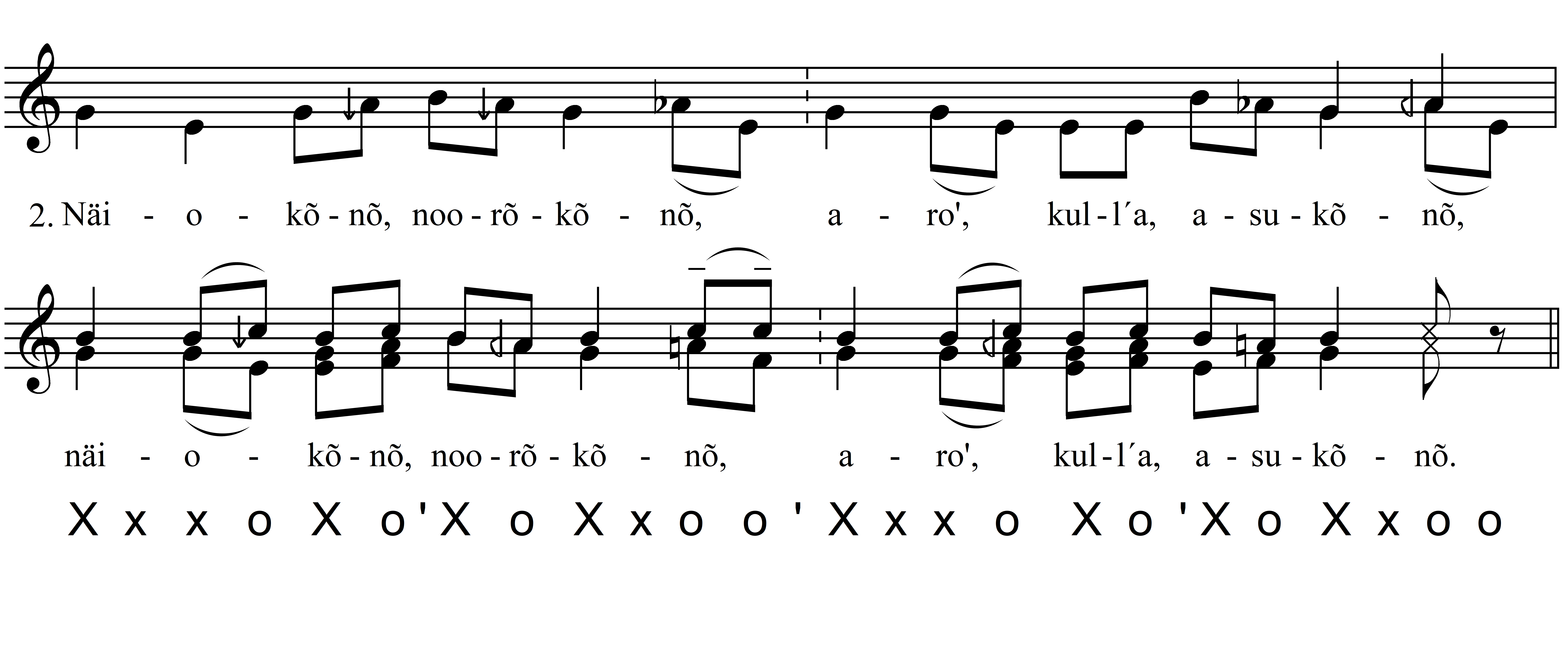 • EKRK, Fon. 89 (a4) < Rõsna k. – Udo Kolk < Elena Laanetu, 66 a., Maria Kägovere, 41 a., Senni Kadastik, 42 a. (06.07.1975) [Neiokõnõ, noorekõnõ, siro-ks, kul´la sitakõnõ!]