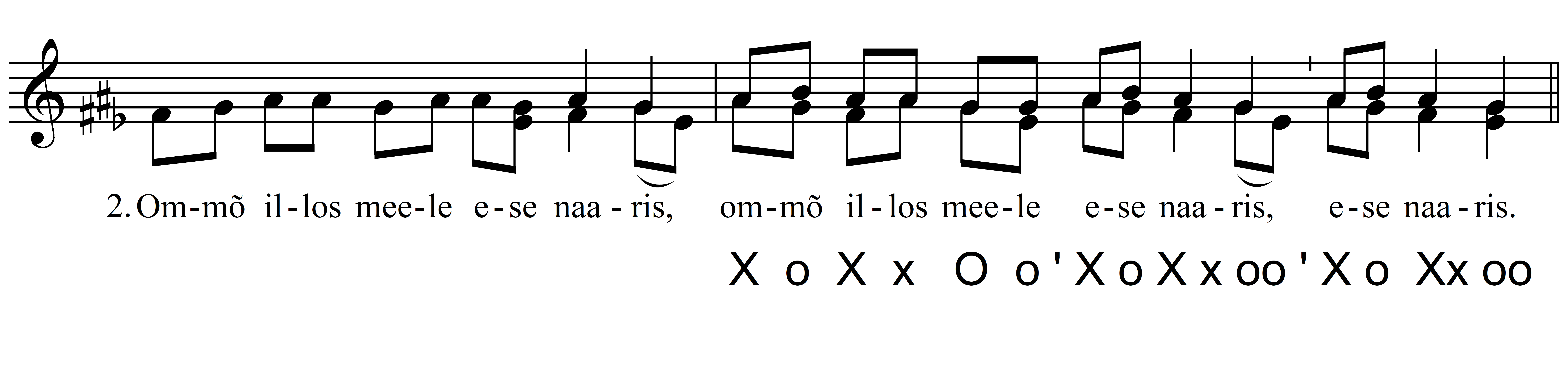 Näide 2. Käsikivilaul (mängulaul), Anne Vabarna ja Ode Vabarna, Tonja k., 1959 (RKM, Mgn. II 321 a).
