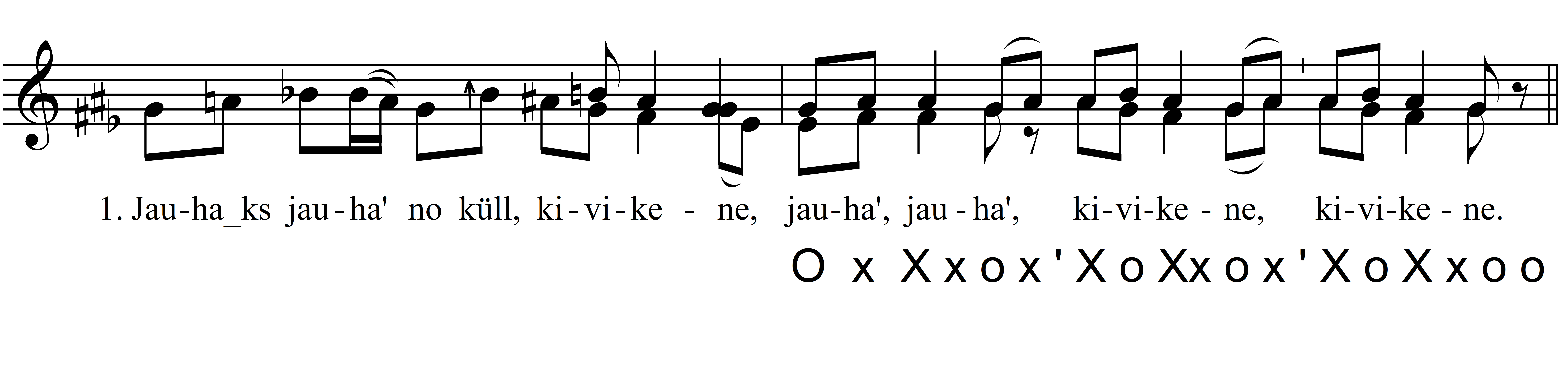 Viisitüübis II.A.1.a kõlab eespool kirjeldatud kolmelöögiline motiiv kolm korda. Sõnalises tekstis vastab igale motiivile värsi poolrida, kusjuures teist poolrida korratakse – värsiehituse skeem on abcdcd. Esimese poolrea teist rõhirühma b mõnikord laiendatakse lisasilpidega, näiteks „jauha’ sa küll“ (värsirea skeem abcdcd). Sel juhul muutub korduva motiivi silbirütm –