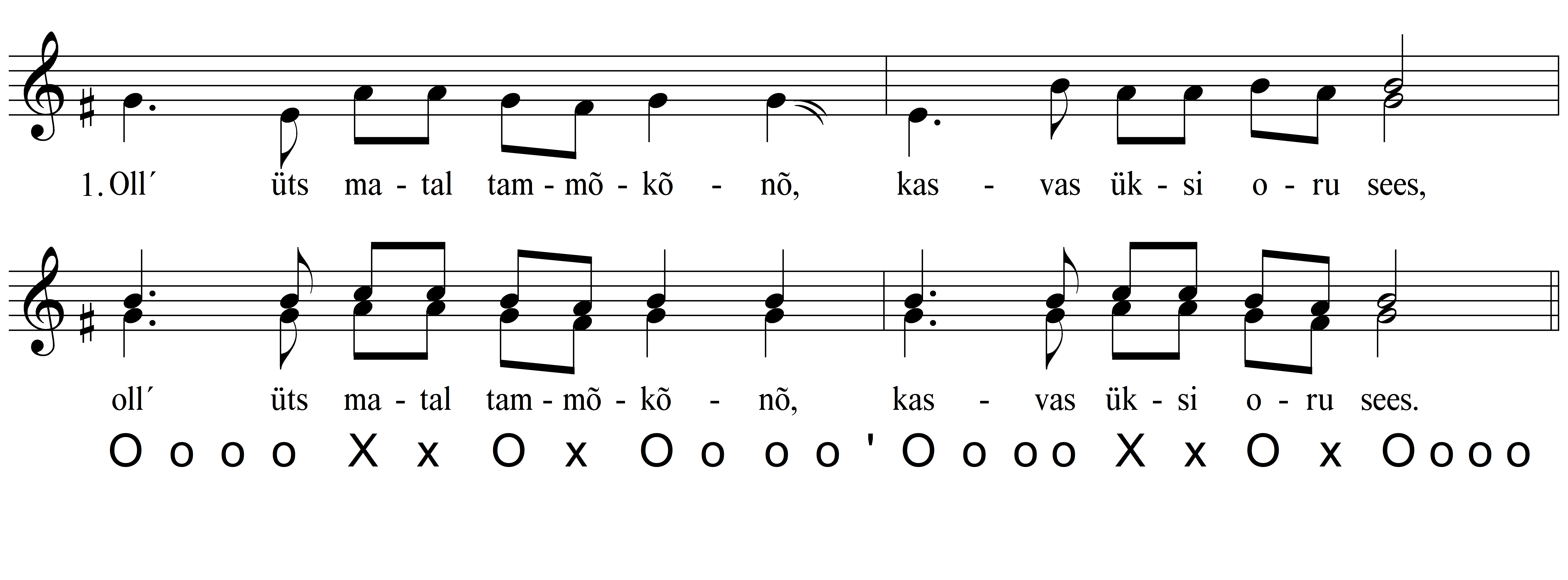 Oll´ üts / matal / tammõ- / kõnõ, // kasvas / üksi / oru / sees