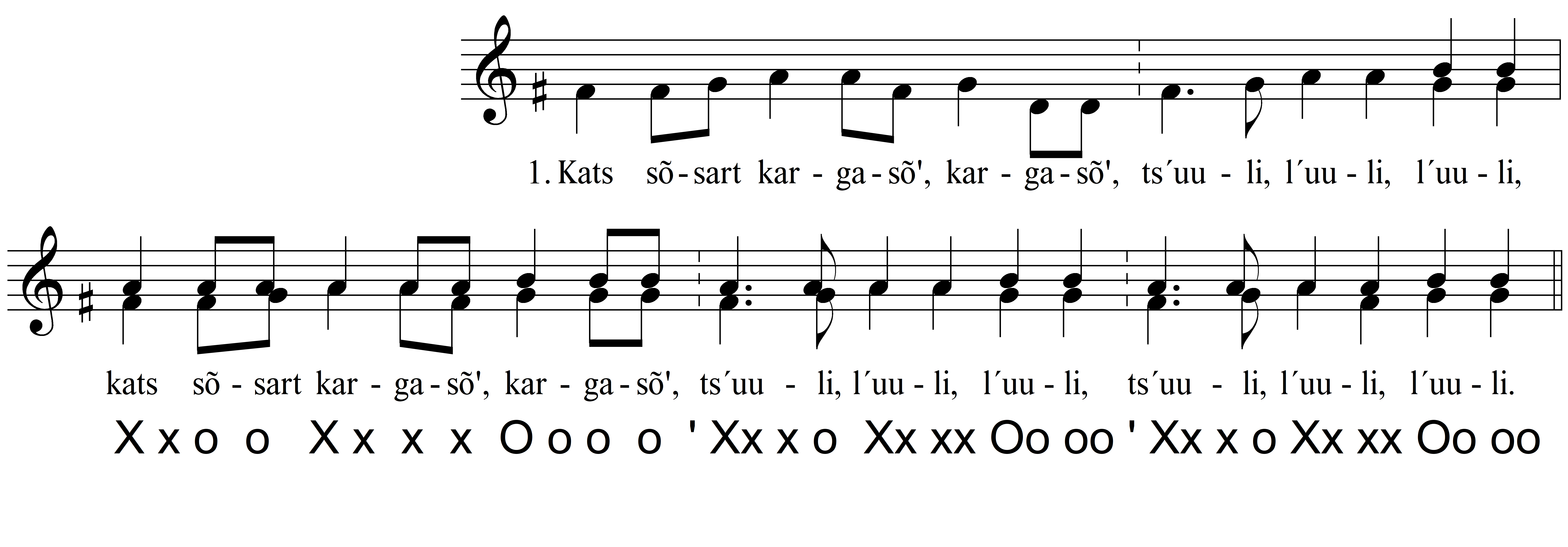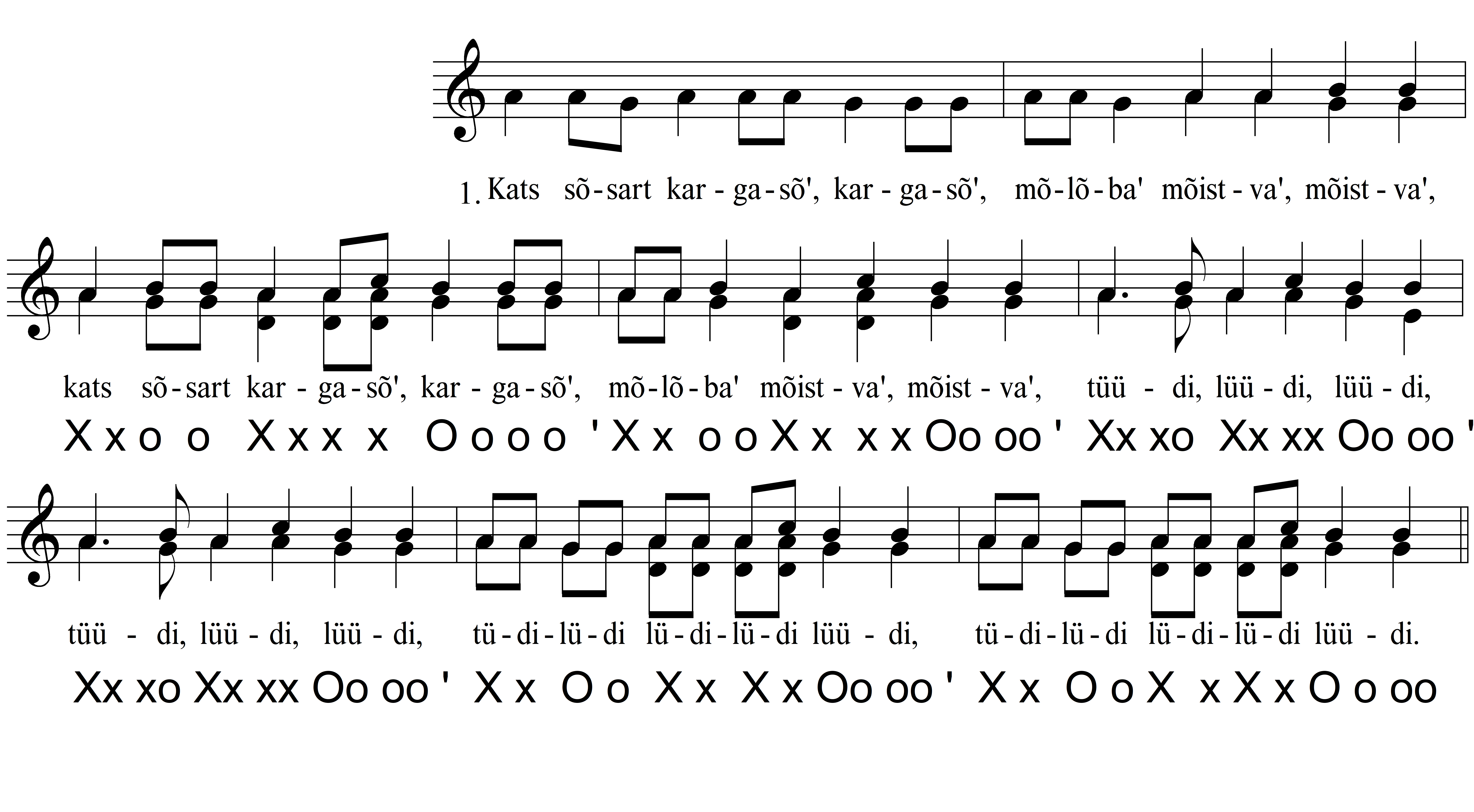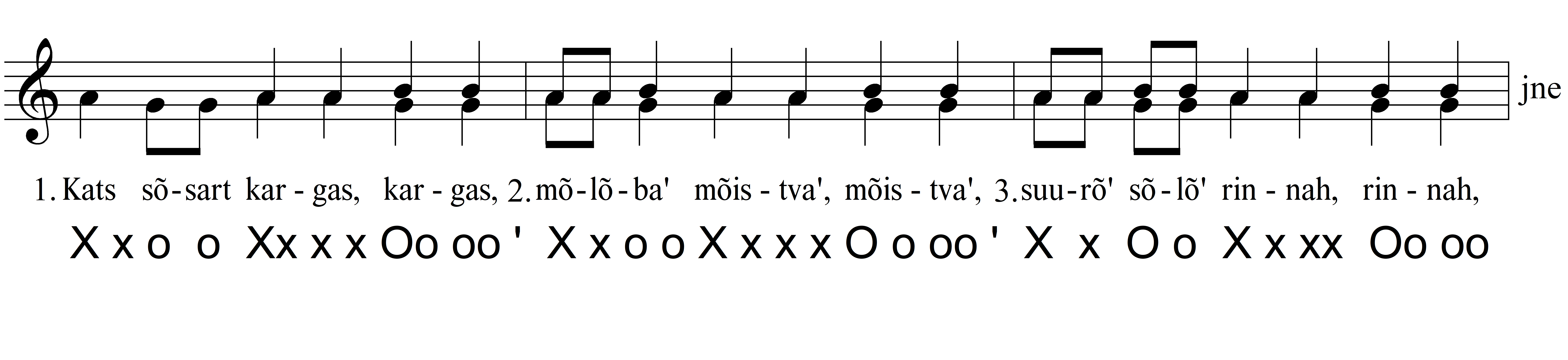 Näide 3. Kargus (tantsulaul), Anna Kõivo leelokooriga „Leiko“, Värska al., 1996 (ERA, DAT 45 (3)).