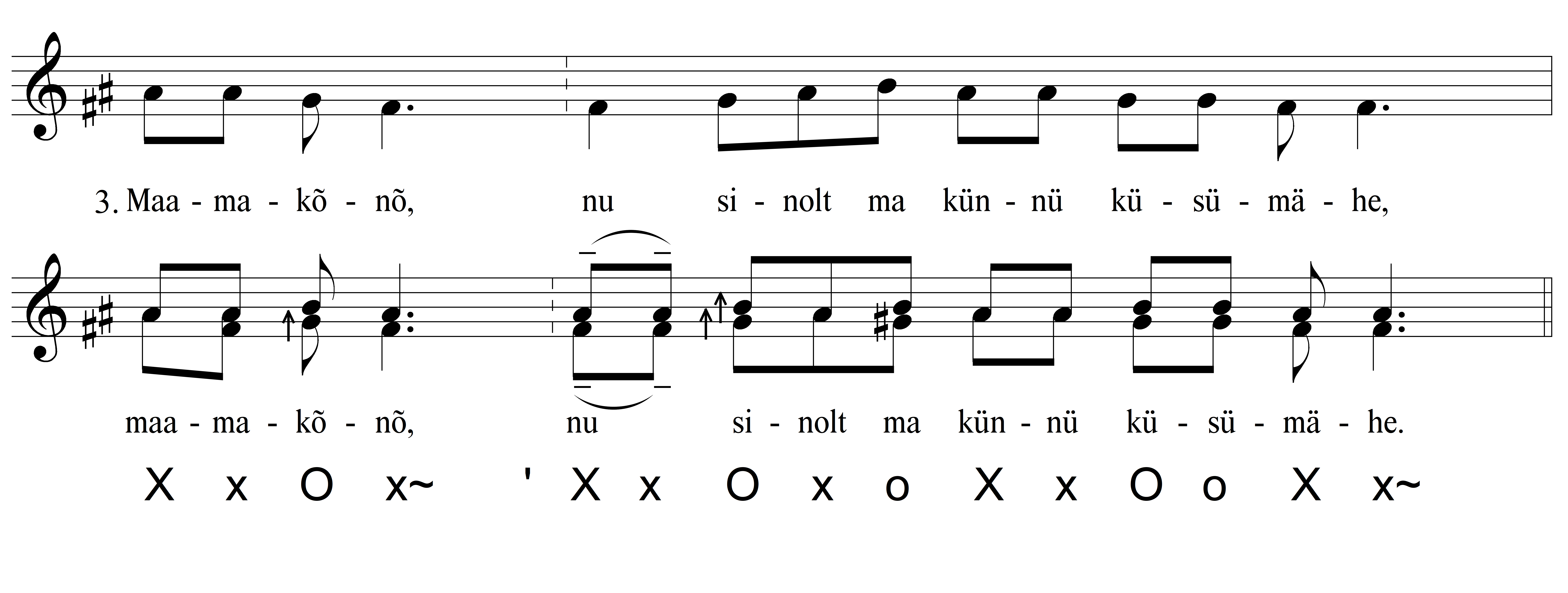 Värsirea ehitus vastab tüüpilisele itkureale (vt I.A.1). See koosneb oma pikemas variandis viiest rõhurühmast, millest teine on kolmesilbiline, lisasilbiga rühm: “mu-u / liidä ma / sinu / liiva- / kohe”. Seda struktuuri võib väljendada tähtedega abc(d)e, kusjuures sulgudes rõhurühm näitab ühe silbi kaotamise võimalust – sel juhul jääb teise poolritta kaks rõhurühma struktuuriga 2 + 3 või 3 + 2. Kirjeldatud põhirea ette lisandub neljasilbiline pöördumisvormel „maamakõnõ“. Kuna viisis vastab ühele silbile üks lühike noot (kaheksandiknoot), siis viisi meetrumimudeliks on vastavalt teksti ehitusele |2 + 2| (2 + 3) + (2 + 2/1 + 2) ja silbirütmi mudeliks on