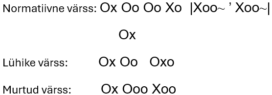 Laiendamata viisirida (7-8 meetrumiühikut) ja neljast silpnoodist (2 + 2) kontrastne refrään (AR