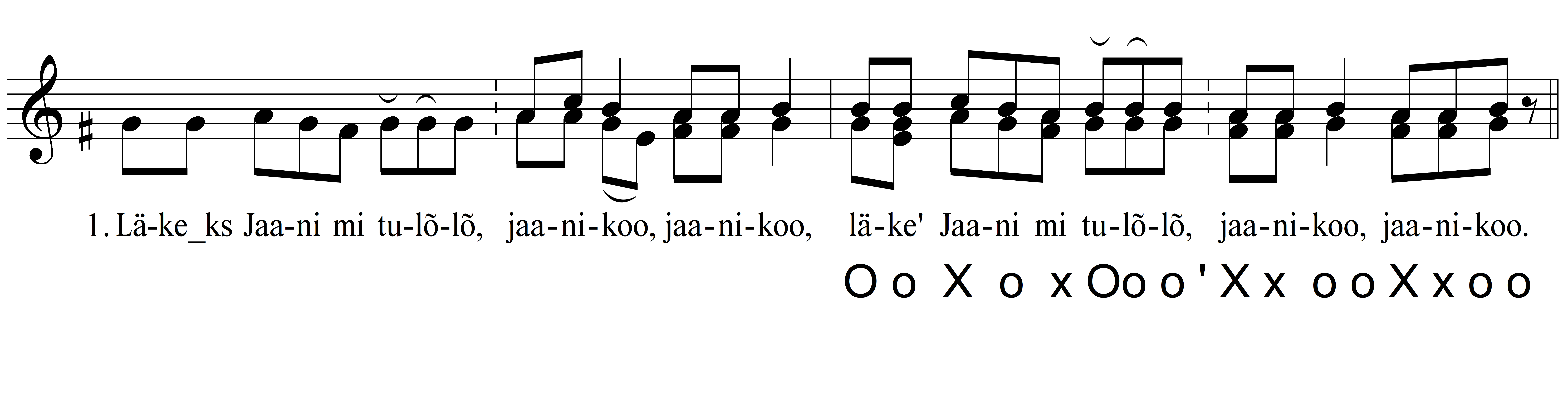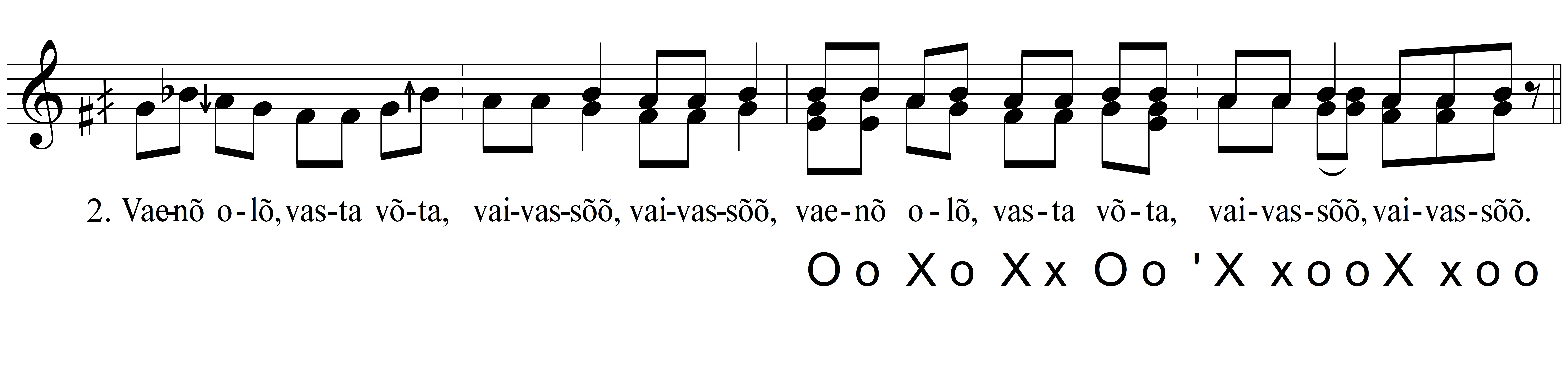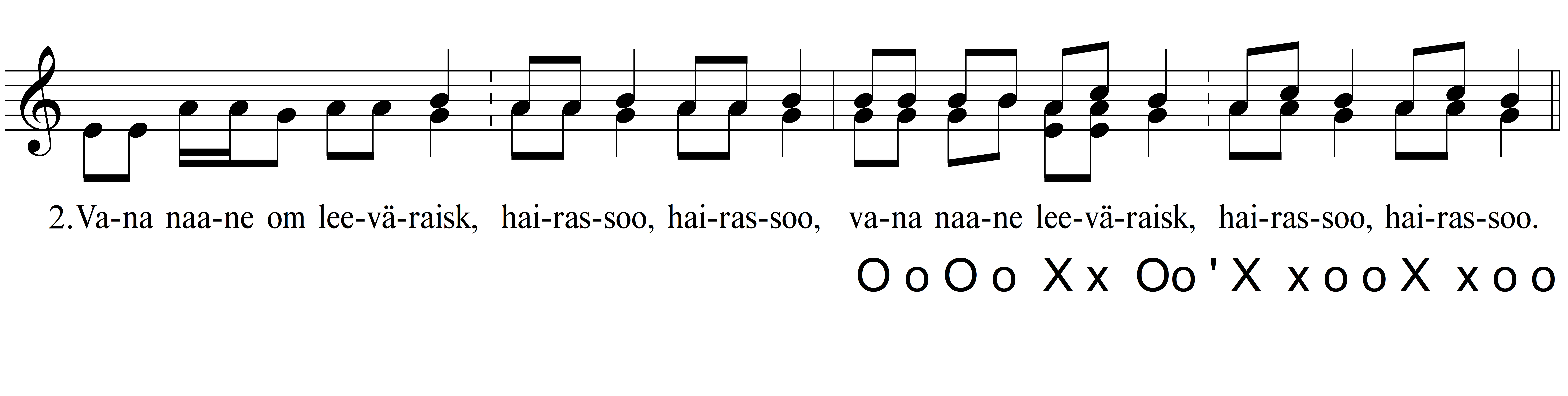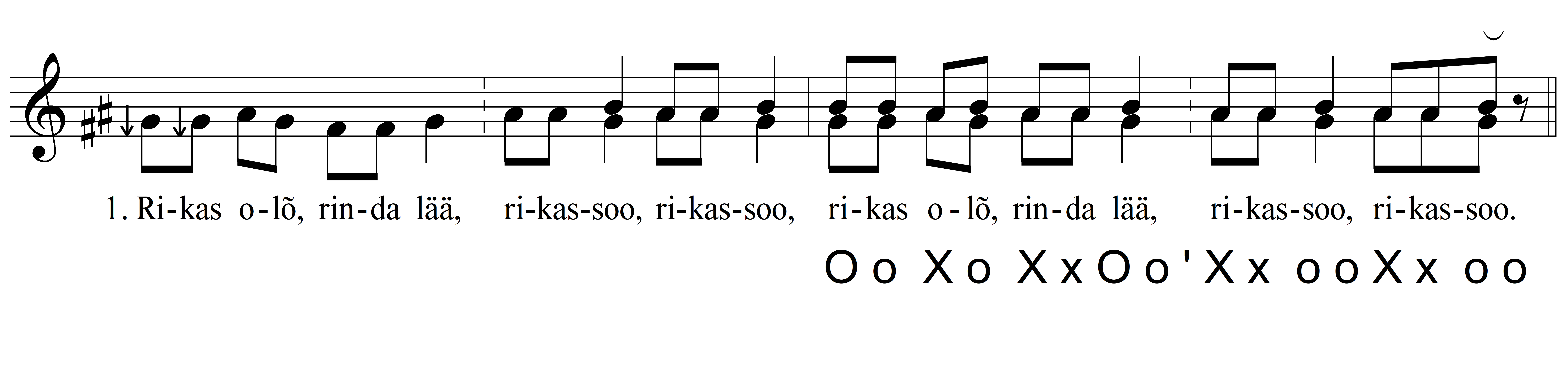 Laiendamata viisirida (8 meetrumiühikut) ja kuuest silpnoodist (3 + 3) kontrastne refrään (AR