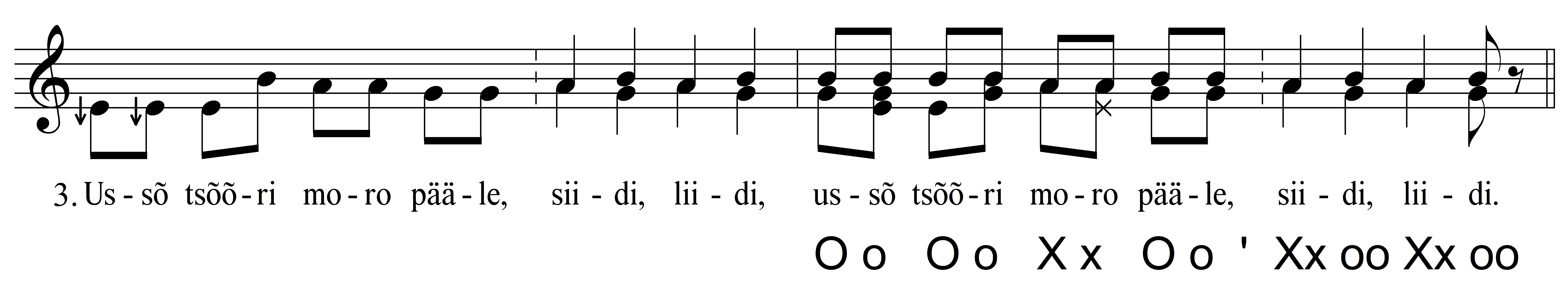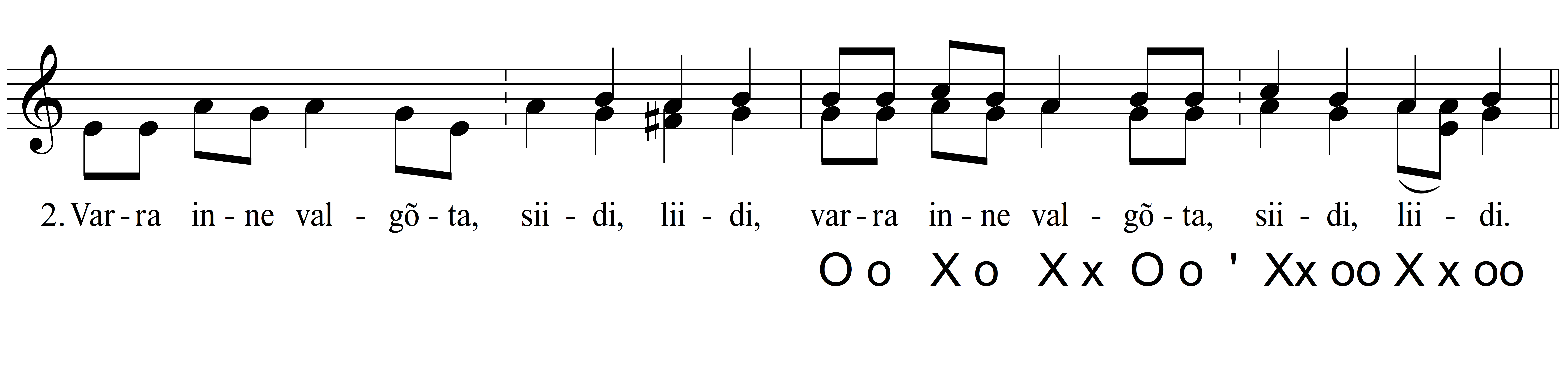 Laiendamata viisirida (8 meetrumiühikut) ja neljast silpnoodist (2 + 2) kontrastne refrään (AR