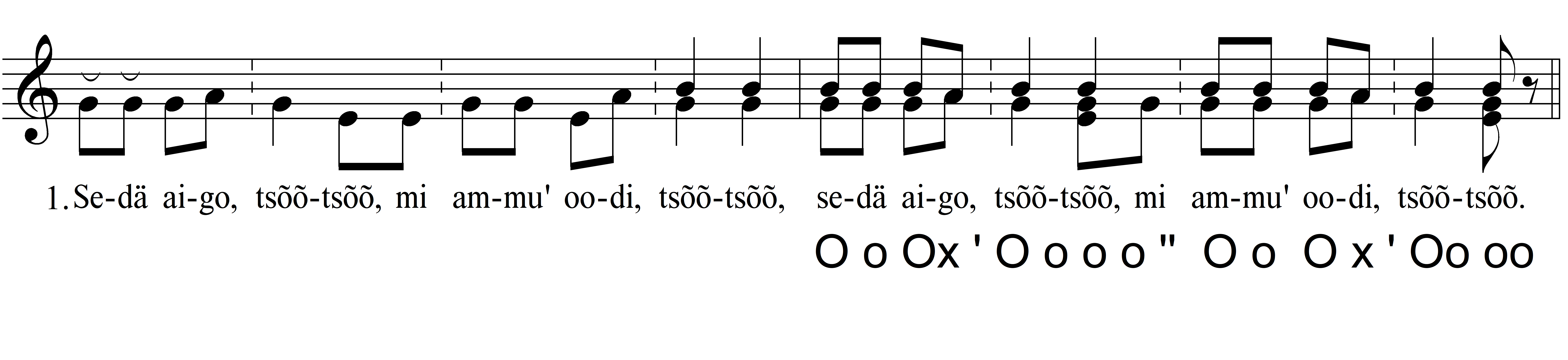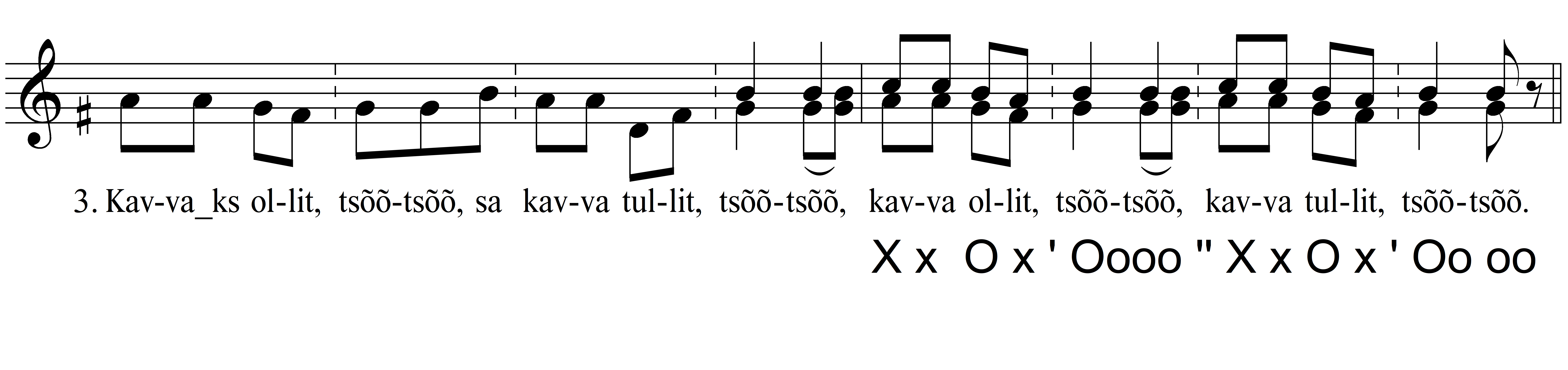 Poolreast ja refräänist koosnev fraas kordub kirjeldatavas viisis neli korda – kaks korda eeslaulja ja kaks korda kooriosas (viisivorm AA
