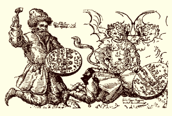 Laplane lööb nõiatrummi. Samuel Rheeni joonistus (1671). Haavio 1947: 85 järgi. Trummil on näha taevakehakujutisi. Paremal on kurat mehe oma võimusse haaranud.