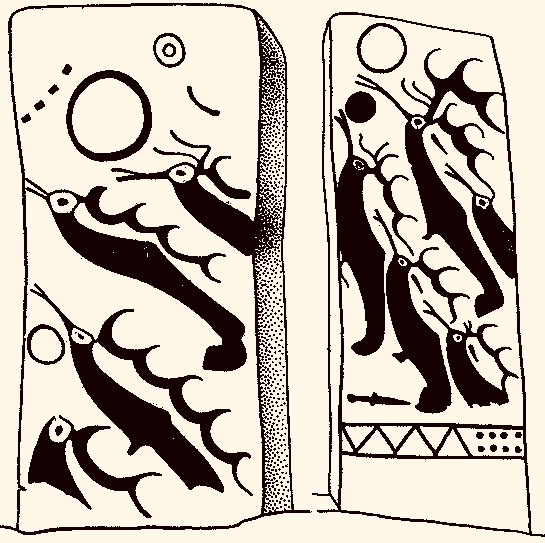 Hirvekivid oletatavate lendhirvede ja päikese kujutistega. Okladnikov, Martõnov 1972: 226 järgi.