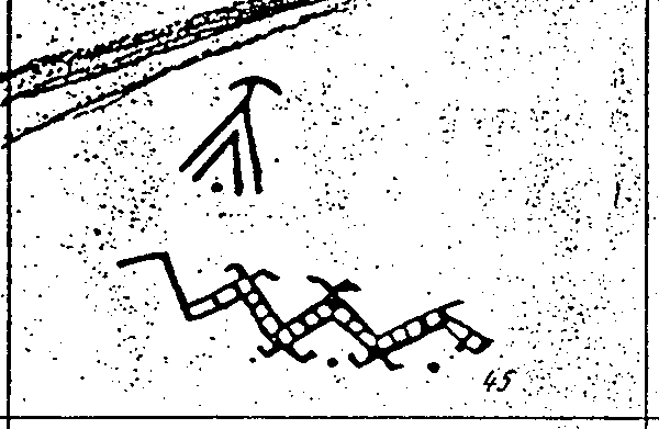 Sellised siksak-motiivid on iseloomulikud Uurali kaljujoonistele. V. N. Tshernetsov, arheoloog ja lingvist, leidis taolistele motiividele vasteid obiugrilaste ehetes, pronksiaja keraamika kaunistustes ja Shigirskist leitud neoliitikumi mõõgapealt (Tshernetsov 1971: 37, 107 jj). Tavaliselt tõlgendab ta selliseid siksak-motiive (joonised 7b ja 7c) kui püünisaedu (Tshernetsov 1964: 24; Tshernetsov 1971: 64 jj). See tõlgendus on küsitav, vähemalt käesolevail juhtudel.