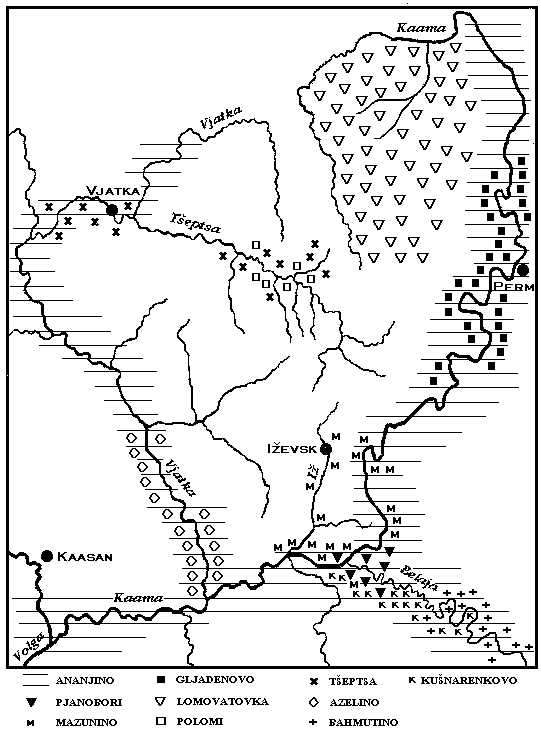 See on osa elektroonilisest väljaandest: Aado Lintrop. Loitsija udmurdi leheküljed. ISBN 9985-851-99-4 Udmurdid on kujunenud ja elanud mitme maailma piiril. Nende kodumaal Kaama ja Vjatka jõgede äärsetes metsades ja metsasteppides on aegade jooksul kohtunud metsavööndi paiksete hõimude ja stepi rändkarjakasvatajate maailm, soome-ugri, indo-iraani ja türgi-tatari hõimude maailm, muhameedlaste, kristlaste ja paganate maailm. Praeguste permi rahvaste (komide ja udmurtide) kauged esivanemad olid Ananjino kultuuri hõimud. Selle varasel rauaajal (VIII-IV saj. e. Kr.) Kaama ja Vjatka jõgikonnas, Belaja alamjooksul ning Volga keskjooksul kujunenud kultuuri kandjad elatusid küttimisest ja kalapüügist, loomakasvatusest ja alepõllundusest (sel ajal oli metsa- ja stepivööndi piir palju kaugemal lõunas kui praegu). Varase Ananjino ajajärgust pärinevad arheoloogilised leiud tunnistavad tihedatest sidemetest sküüdi-kimmeri maailma ja Põhja-Kaukaasia hõimudega. Nii on näiteks 46% tolle perioodi relvaleidudest lõunapoolse päritoluga (Ivanov 1980: 75). Varast Ananjino kultuuri iseloomustavad ka mitmesugused loomi kujutavad ehted ja esemed, millest osa (greife, tiivulisi inimpeaga lõvisid ja hüppevalmis pantreid kujutavad vööde metallosad) on valmistatud Kaukaasias ning kannavad Urartu kultuuri jälgi. Ent juba VII-VI sajandil e. Kr. ilmusid sisseveetud looma- ja linnukujutiste kõrvale ka kohalike meistrite tööd, mida kaunistasid lendavate lindude, sisalikusarnaste olendite, hobuste ja põtrade pead ja veelindude figuurid. Need olid stiililt ja teostuselt lähedased sküüdi loomornamendi varastele näidetele (Korepanov 1980: 298-300). Võib-olla andsid just kaukaasia, kimmeri ja sküüdi meistrite tööd algtõuke permi loomornamendi kujunemisele, mis saavutas õitsengu Lomovatovka kultuuri ajal. Varasesse Ananjino ajajärku jääb ka esimeste neemiklinnuse tüüpi kindlustatud asulate tekkimine Volga kesk- ja Kaama alamjooksule. Neis võrdlemisi väikestes asulates elas umbes 50-60 ühte sugukonda kuuluvat inimest pikkades muldpõranda ja lihtsa koldega palkmajades (mitu suguluses olevat peret ühes majas koos). Väljakaevamistel leitud jälgede järgi oli tolleaegse maja suuruseks 40-210 m2 (Ivanova 1994: 29-30). Ananjino-aegsed matusepaigad paiknevad jõgede kallastel. Surnud maeti seliliasendis, jalgadega jõe poole. Esineb palju paarishaudu - naine ja mees, naine ja laps, mees ja laps. Sageli ehitati haua peale puust hauamaja. Enamikust haudadest on leitud relvi, tööriistu, ehteid, harvem nõusid ja loomaluid. Esimese aastatuhande keskel e. Kr. vähenes Ananjino kultuuri kandjate läbikäimine rändkarjakasvatajate hõimudega. VI-IV saj. matusepaikadest leitakse varasemaga võrreldes märgatavalt vähem lõunapoolse päritoluga ehteid ja relvi. Ilmselt tingis suhete jahenemise liiga lähedasest naabrusest tingitud poliitiline pinge. Just sel perioodil kasvas vibu ja noolte osatähtsus ananjinlaste relvastuses, Belaja vasakule kaldale aga rajati linnused, mis pidid kaitsma sealseid paikseid hõime rändkarjakasvatajate kallaletungide eest (Ivanov 1980: 77-78). Kuna Ananjino hõimude tollaste naabrite Prohhorovo kultuuri sarmaatide hulgas mängisid paljude teadlaste arvates olulist rolli Uurali-tagused hõimud, on seletatavad ka Lääne-Siberi päritoluga relvaleiud hilise Ananjino ja Kara-Abõzi kultuuri Belaja jõe keskjooksu matusepaikades (Ivanov1980: 79, 1984: 40). Ent sidemed Lääne-Siberiga ei muutunud üldvalitsevateks - Pjanobori kultuuri (III saj. e. Kr. - II saj. p. Kr. Belaja alamjooksul ja Kaamal, nimetatud ka Tsheganda kultuuriks) arheoloogiliste leidude hulgas on Siberi päritoluga esemeid suhteliselt vähe. Oletatavasti lahkusid sarmaadid II saj. e. Kr. Lõuna-Uurali steppidest läände, poliitiline olukord stabiliseerus ja taastusid traditsioonilised sidemed lõunapoolsete rändkarjakasvatajatega (Ivanov 1980: 79). Jätkuvalt olid vaadeldava territooriumi soome-ugri hõimude peamisteks elatusaladeks loomakasvatus, alepõllundus, küttimine ja kalapüük. Pjanobori kultuuri linnamäed olid suuruselt erinevad - väikesed, alla 2000 m2 pindalaga linnamäed olid ilmselt kasutusel vaid varjupaikadena sõja korral, suuremaid (üle 5000 m2 pindalaga) kasutati alaliste elupaikadena. Hästi on läbi uuritud Tsheganda I linnamägi Kaama kaldal Belaja suudme vastas. Arvatavasti koosnes järskude uhteorgude vahelisel neemikul paiknenud ja kahest ohtlikumast küljest kuni viie meetri kõrguste muldvallidega kindlustatud asula 20-25 palkmajast. Maapinnale ehitatud 7-8 palgikorrast koosnevate seintega majad olid kaetud kõrgete viilkatustega. Iga umbes 12 meetrit pika ja 5 meetrit laia maja keskel oli kolle (mõnes majas kaks), piki seinaääri paiknesid lavatsid. Maja juures olid majapidamisaugud tagavarade hoidmiseks. Igas majas elas umbes 20-25 inimest, s.o. üks suur patriarhaalne perekond. (Ivanova 1994: 40-41.) Surnuid maeti Pjanobori kultuuri ajal kõrgele jõekaldale, haud kaevati madal, kalmuküngast ei tehtud. Surnud asetati selili, sageli peaga jõe suunas, käed külgedel. Selle perioodi haudadest on leitud rikkalikult pronksehteid (eriti naiste vööpandlaid), harvem esinevad tööriistad, relvad ja keraamika. Pjanobori kultuuriga samaaegse Gljadenovo kultuuri (III saj. e. Kr. - III saj. p. Kr. Kaama keskjooksul) kandjate seas oli levinud põletusmatus. Gljadenovo lähedalt matuse- ja kultusepaigast on leitud hulgaliselt pronksist valatud karu, põdra, hobuse ja ratsaniku kujutisi, mitmed neist riputamise tarvis augu või aasaga varustatud (Golubeva 1979: 6).