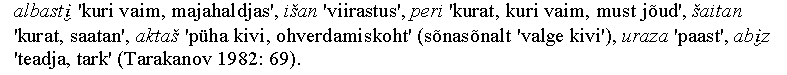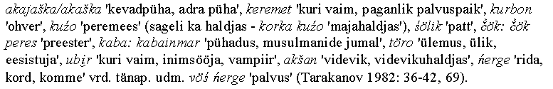 komponendiks on sõna 1236. aastal vallutasid mongoli väed Volga-Bulgaaria. Vallutajate eest pageti riigi äärealadele ja kaugemalegi. Seetõttu laienes XIII sajandil bulgaaride asuala. 1323. aastast on pärit bulgaari hauakivi Tsheptsa jõel, mõned teadlased peavad selle naabruses olnud asulaid ja linnust bulgaaride omadeks (vt. Halikov 1978: 98). Bulgaarid asustasid ka Iki jõe basseini ja Belaja alamjooksu, islamiseerides sealsed türgi-tatari hõimud (Halikov 1978: 99). Segunedes kohalike hõimudega, panid bulgaarid aluse volgaäärsetele tatarlastele ja tshuvashshidele. Tatari rahva kujunemisel mängis olulist rolli 1438. aastal rajatud Kaasani khaaniriik, mille koosseisu jäid ka lõunapoolsed udmurdi hõimud. Vene XIV-XVI sajandi kroonikate põhjal on järeldatud, et üheks Kaasani khaaniriigi osaks oli Ari (Arski) osastisvürstiriik, kus valitsesid udmurdi vürstid, kellel olnud oluline mõju kogu khaaniriigi poliitikale (Hudjakov 1923: 48, 193). Siiski mainib umb. 1560 aastal kirjutatud "Kaasani ajalugu", mis jutustab Kaasani khaaniriigi tekkimisest, ajaloost ja vallutamisest, Arskiga seoses vaid tsheremisse (marisid): "seal on vana linnus, nimega Arsk, tugev otsekui kindlus, tornide ja laskepiludega ning elab seal palju rahvast... ning seisab Kaasanist 60 versta kaugusel väga läbipääsmatuis paigus, soodes ja metsades, ja on ainult üks tee sinna minna ja tulla. Näeb väepealik vürst Simeon, et seda pole nii lihtne ära võtta, kuna seal on liiga palju rahvast, ainuüksi sõdalasi 15 000, ja veeretab suurtükid ja arkebuusid ligi ja annab tuld, aga arski vürstid ja kogu tsheremisside hulk, kes seal sees istub, hakkab kisendama ja avab väravad, sest jumal on nende südameisse hirmu pannud... Ja Vene võtab neid vangi ja toob kohale 12 arski vürsti ja 7 tsheremissi väepealikut, 300 parimat sadakonnaülemat ja vanemat, kokku 5000 inimest." (Kaasani ajalugu 132-133. Kõik vangid hukati Kaasani kaitsjate hirmutamiseks otse linnamüüri all). Tsiteeritud teost ei peeta kuigi usaldusväärseks allikaks, kuna anonüümne autor on kirjutamisaegset poliitilist situatsiooni arvestades paljusid sündmusi tendentslikult valgustanud. Siiski võib see tõsiasi, et "Kaasani ajaloos" udmurtidest üldse juttu pole (v.a. mõnel korral esinevad arski vürstid ning kohanimed Arsk ja Arski väli), marisid aga sageli mainitakse, viidata asjaolule, et udmurdid ei olnud Kaasani khaaniriigis märkimisväärne sõjaline jõud.(5) Ilmselt võib arski vürstide ja maride eraldi nimetamises siiski näha viidet linna ülikkonna udmurdi päritolule. Kaasani khaaniriigi ajal jätkus islami mõju udmurdi usundile. Udmurdi keelde tuli suur hulk tatari sõnu, näiteks usundiga seostuvad: ![]() Põhjaudmurdi hõimud sattusid üsna varakult Venemaa ja ristiusu mõjusfääri. Kuigi XIV sajandil komisid paganlusest pööranud püha Stefani (surn. 1396) tegevus neid veel otseselt ei puudutanud, võisid kuuldused tema tegudest ka Tsheptsa kallastele jõuda. Aastail 1471-1472 korraldas Ivan III sõjakäigu itta ja muutis Permi vürsti Mihhaili oma vasalliks. XV sajandil kujunes Vjatka ülemjooksule imbunud vene asustuse baasil välja nn Hlõnovi vabariik, mis sõjalise jõuna kujutas endast üsna kirju päritoluga vabameeste hulka keda juhtisid väejuhid-atamanid. Tsheptsa kultuuri järgsete udmurdi hõimude vahetus naabruses paiknedes avaldas Hlõnov neile kahtlemata poliitilist survet - kroonikates mainitakse vjatkalaste kõrval ka nendega koos tegutsenud ari vürste. Moskva püüdis korduvalt allutada sõnakuulmatuid vjatkalasi, need omakorda vastasid peamiselt Ustjugi vastu suunatud röövretkedega. Viimaks koondas Ivan III sõjakäiguks Moskva, Vladimiri ja Tveri alade 64-tuhandelise väe: "Sellesamase 6997 (1489) aasta kevadel, 11. juunikuu päeval saatis kogu Venemaa suurvürst Ivan Vassiljevitsh vürst Daniil Vassiljevitsh Shtshenja väega Vjatkale nende sõnakuulmatuse pärast, ja teise väepealiku Grigori Vassiljevitsh Morozovi ning muid väeülemaid suure sõjaväega. Nad läksid linnasid ära võttes, vjatkalasi endid aga [risti] suudlema(6) ning arisid truudust vanduma pannes." Nii jutustab kroonika (vt. Vladõkin 1994: 57-58, Grishkina 1994: 31-34). Vallutatud aladel rakendas Ivan III harjumuspärast poliitikat - vastuhakkude ärahoidmiseks asustas ta tähtsamad suurmaaomanikud ja kaupmehed ümber Moskva vürstiriigi eri piirkondadesse. Ellujäänud vjatka ülikute saatust jagasid ka ari vürstid, ent peagi lubati neil kodumaale tagasi pöörduda. Seal aga said nad maad ja talupoegi juba Moskva suva järgi. Sel kombel allutatud udmurdi ülikuid kasutas Venemaa edaspidi oma huvides nii sõjakäikudel kui ka ülestõusude mahasurumisel. (Grishkina 1994: 33, 52-53.) Kuigi paljud (eriti sovjetiaegsed) autorid on püüdnud kroonikatest esile tõsta just neid kohti, kus on juttu lõunaudmurtide pagemisest vastsetele Vjatka-äärsetele Vene aladele (aga sinna meelitas Moskva neid mitmete soodustustega), et selle põhjal rääkida kõigi udmurtide soovist ühineda Venemaaga, ei kippunud ei udmurdid ega marid ega tatarlased siiski Moskva tiiva alla. Miks muidu tuli Arsk tormijooksuga vallutada.(7) Miks muidu täitis 1552. aasta sügisel Kaasanit piiravat suurvürsti raev, nii et ta "mõistis kõik linnustes kinni võetud tsheremissid, kokku kuni 7000 inimest, surma: osa ajas linna lähedal teibasse, osa surmas üht jalga pidi, osa aga kaelapidi üles puues, teised jälle tappis relvaga kaasanlaste hirmuks..." (Kaasani ajalugu 135.) Pärast seda, kui vene väed 2. oktoobril linna vallutasid ja kõik elanikud v.a. "noored poisid, tüdrukud ja ilusad naised" maha tapsid, läkitas suurvürst kõikjale saadikud alistumistingimustega, millest peamised olid truudusevanne ja sama suur naturaalmaks, kui khaanide ajal. Vallutajate metsikusest shokeeritud Arski piirkonna elanikud saatsid kasakate Shemai ja Kubishiga Ivan Julmale palvekirja, et valitseja nende peale halastaks ja käsiks maksu võtta nii, nagu eelmi