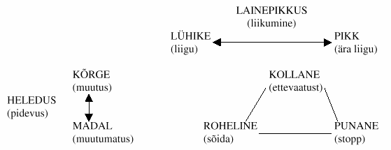 Kogu selle argumendi olemuse võib esitada diagrammina, mis on allpool (Joonis 1), mis kujutab kahte üksteise peale pandud kolmnurka. Esimese kolmnurga nurgad on värvid ROHELINE, KOLLANE, PUNANE, mis on eristatud kahe teljega: (1) lühike lainepikkus/pikk lainepikkus ja (2) madal heledus/kõrge heledus. Teise kolmnurga nurgad märgivad kolme liikumisega seotud juhist: SÕIDA - jätka liikumise olekus, ETTEVAATUST - valmistu muutma oma liikumise olekut, STOPP - jätka mitteliikumise olekus. Need teated on jällegi eristatud kahe teljega: (1) liikumine/mitteliikumine ja (2) muutus/mittemuutus. Pannes kaks skeemi kokku, muutuvad värvid järgnevate käskude signaalideks: värvide seose loomulik struktuur on sama kui loogiline struktuur seoses kolme juhisega: