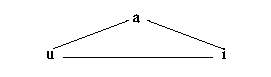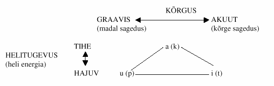 Mittediferentseeritud konsonant (C) on sel juhul sagedust eristades jagatud madala sagedusega (graavisega) komponendiks (/p/) ja kõrge sagedusega (akuudiga) komponendiks (/t/). Sel juhul tugeva energiaga (kompaktne) velaarne ahtuskonsonant (/k/) täiendab mittediferentseeritud tugeva energiaga (kompaktset) vokaali (/a/), samas kui vastavalt madala energiaga (hajusad) vokaalid (/u/-graavis, /i/-akuut) täiendavad madala energiaga (hajusaid) konsonante (/p/ ja /t/). Kogu väite võib esitada kaksikkolmnurgana konsonantidest ja vokaalidest (Joonis 2), mis eristuvad tiheduse/hajususe ja graavise/akuudi poolest.