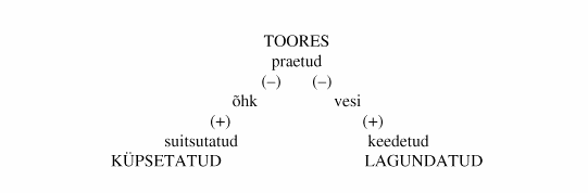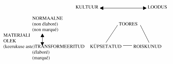 Pealegi, kui me vaatame fakte, siis kategooriad, mida käsitletakse toidu liikide tähenduses, on iseenesest huvitavad. Ükskõik millise inimasustuse toitumus on sõltuv vahendite kättesaadavusest ja toiduainete (leib, lambaliha, juust jne) tasandil on väga vähe vahet inglise koduperenaise ostukorvi ja amazoonase indiaanlasele kättesaadavate toiduainete vahel. Aga Inglise koduperenaine ja amazoonase indiaanlane jagavad ühte moodi kategooria 'toit' ühikud hulgaks alakategooriateks, 'toit A', 'toit B', 'toit C' jne, millest igat üht käsitletakse erineval viisil. Sellel tasandil aga kategooriad A, B, C jne on märkimisväärselt sarnased igal pool. Nad on tegelikult sama liiki kategooriad, mis esinevad joonisel 4 ja oluline selliste kategooriate juures on see, et nad esinevad sotsiaalse prestii~i väga erinevatel tasanditel. Ma ei mtle ainult seda, et pidusöögi komponendid vib alati mahutada meie kolmnurga aukudesse: austrid (toores), suitsulhe (suitsutatud), vähisupp (keedetud), lambaribi (tulel küpsetatud), suflee (küpsetatud), Stiltoni juust (lagundatud) - pigem, et neist erinevatest põhilistest klassidest toidud toovad omavahel esile standardiseeritud suhte. Näiteks, meie konventsioonide järgi, kui menüü sisaldab küpsetatud liha, saab ta austava koha keskel; hautatud ja keedetud toite teisest küljest peetakse sobivaks eriti invaliididele ja lastele. Miks peab see olema nii? Miks me kipume mõtlema keedetud kanast kui argisest toidust, aga praetud kanast kui piduroast?